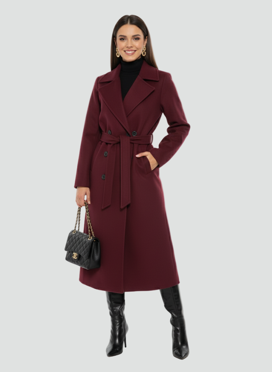 Denne elegante frakke i dyb vinrød nuance er det perfekte valg til den moderne kvinde. Det lange, figursyede snit skaber en flatterende silhuet, mens bæltet i taljen tilføjer et feminint touch. Frakken har et klassisk design med dobbeltradede knapper og reverskrave, som gør den ideel til både hverdagsbrug og særlige lejligheder.