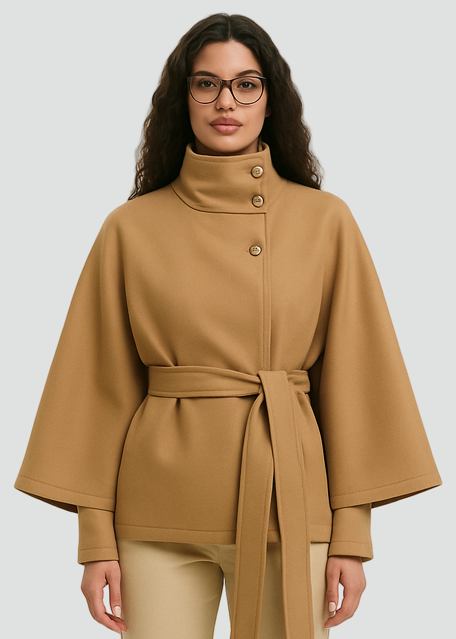 Denne elegante kappefrakke kombinerer komfort og stil i ét tidløst design. Den høje krave giver ekstra varme og et sofistikeret udtryk, mens det justerbare bindebælte fremhæver taljen for en feminin silhuet. De brede ærmer og det bløde stof gør frakken både moderne og behagelig – perfekt til både hverdagsbrug og mere formelle anledninger.
