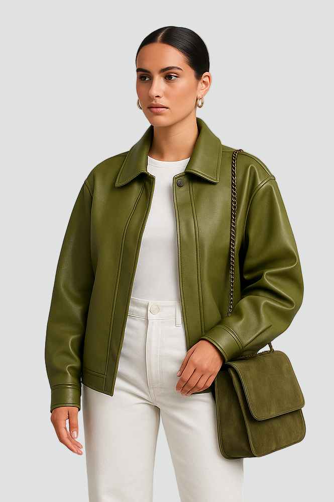 Stilfuld Grøn Dame Læderjakke med Oversized Pasform og Krave